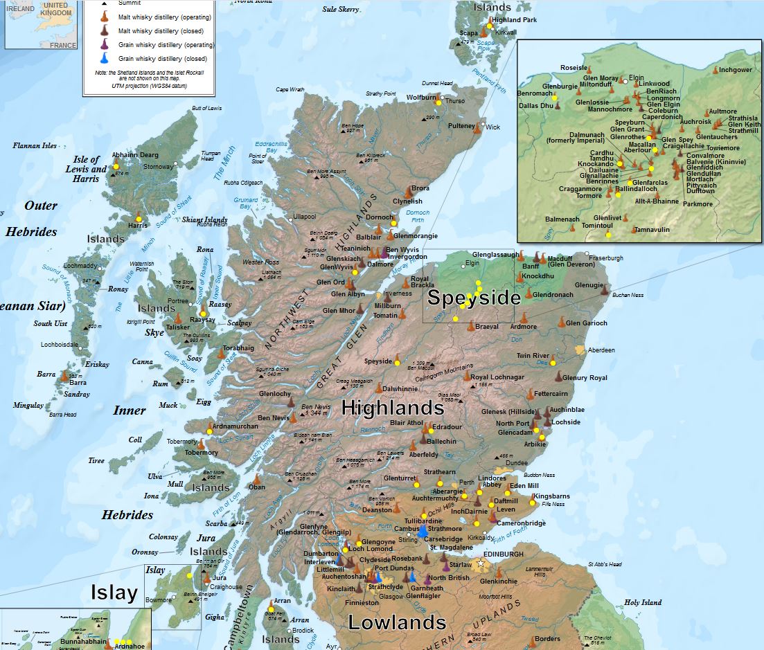 I would prefer to to visit the smaller and independent distilleries, (listed here) they are also indicated by the yellow dots on the map above.